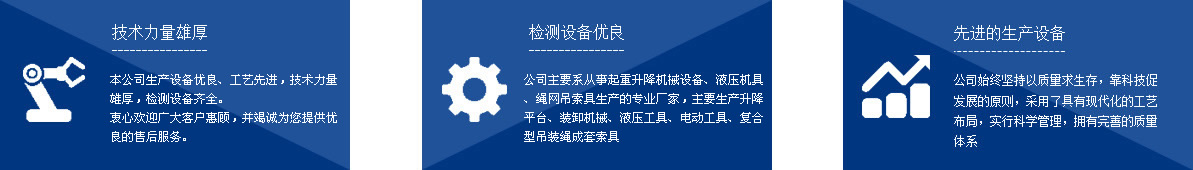 泰州市如意機(jī)械設(shè)備有限公司,座落在中國(guó)海軍誕生地江蘇泰州市,緊連328國(guó)道,東有鐵路相連,同時(shí)有滬寧、寧通高速公路相交,地理位置十分優(yōu)越,自然環(huán)境得天獨(dú)厚。 本公司系從事起重升降機(jī)械設(shè)備、液壓機(jī)具、繩網(wǎng)吊索具生產(chǎn)的專(zhuān)業(yè)廠(chǎng)家,主要生產(chǎn)千斤頂、液壓拉馬、軸承加熱器、升降平臺(tái)、裝卸機(jī)械、液壓工具、電動(dòng)工具、復(fù)合型吊裝繩成套索具、高強(qiáng)纖維柔性吊裝帶、起重鏈條成套索具、橫梁吊具、注塑繩、軟梯、安全帶、安全網(wǎng)等幾大系列、上百種規(guī)格的產(chǎn)品,廣泛應(yīng)用于電力、油田、大型鋼廠(chǎng)、機(jī)電、化工、航空、冶金、機(jī)械、鐵道、造紙、港口、建筑等領(lǐng)域。 本公司生產(chǎn)設(shè)備優(yōu)良、工藝先進(jìn),技術(shù)力量雄厚,檢測(cè)設(shè)備齊全,其中升降平臺(tái)、千斤頂、吊具、加力扳手、液壓矩扳手經(jīng)泰州質(zhì)量技術(shù)監(jiān)督局監(jiān)督檢驗(yàn) ...[點(diǎn)擊詳情] |